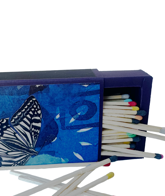 Do you need a bit more light in your life? Light your fireplace and candles with our Butterfly Effect matches. Each box is handmade with butterfly art on the cover, a full rainbow of approximately 75 matches and three enclosed cards with inspirational quotes on the back.