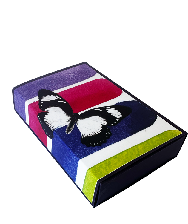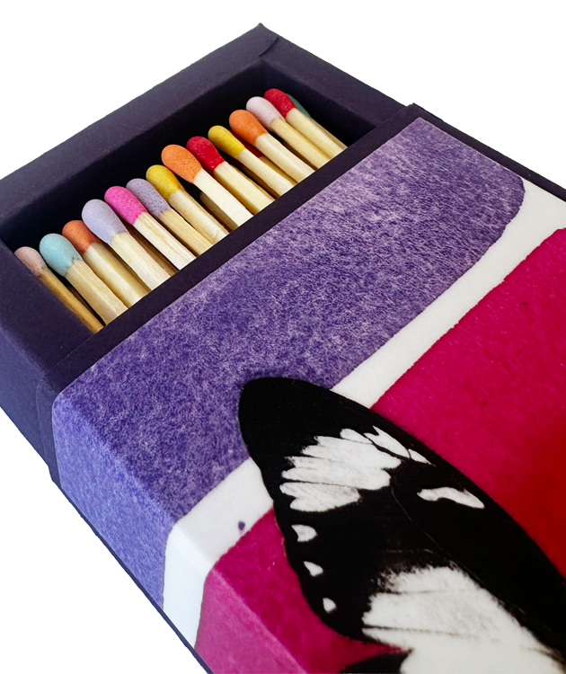 Do you need a bit more light in your life? Light your fireplace and candles with our Butterfly Effect matches. Each box is handmade with butterfly art on the cover, a full rainbow of approximately 75 matches and three enclosed cards with inspirational quotes on the back.